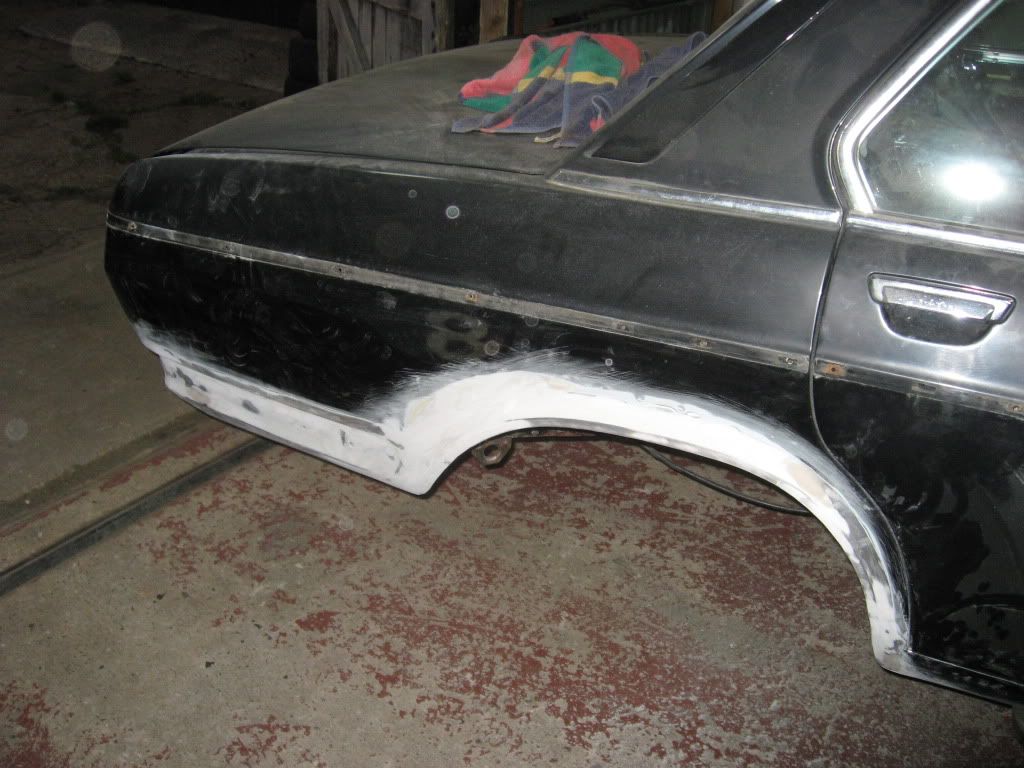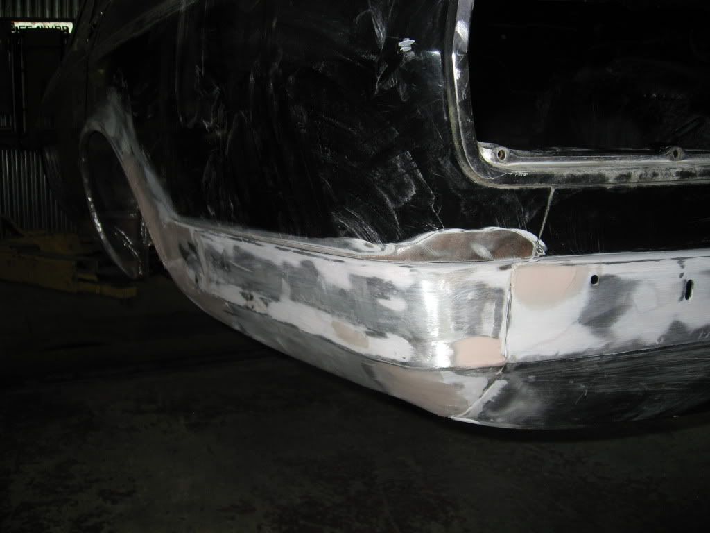 ![]() ![]() Body filler applied and flatted back on rear arches and rear quarter panels, etc;